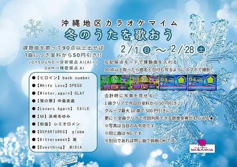 課題曲を歌って1曲クリア毎に室料50円引き!最大500円引きに!!!更にフルコンボは飲食金券がもらえる♪