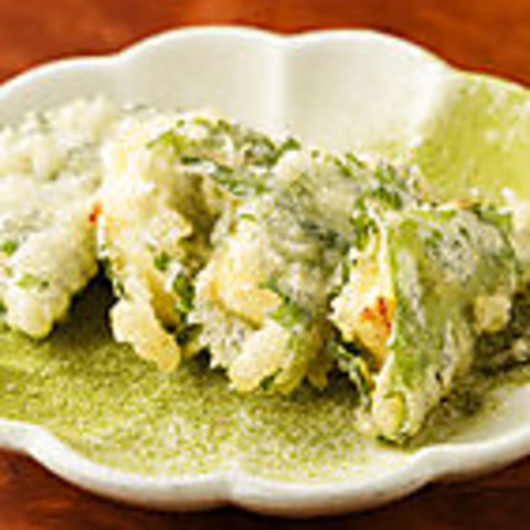 西京味噌で寝かせたクリームチーズを、大葉で巻いた天ぷら。人気メニューです!