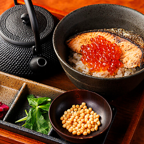 食べやすいようにほぐした鮭と大粒のイクラの相性が抜群です。出汁は【トビウオ】の出汁´アゴ出汁´を使用。玄米を使用したアゴ出汁の究極茶漬けをご堪能ください。