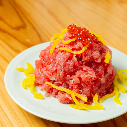 マグロの旨み、たくあんの食感、いくらのプチプチ感が三位一体。お酒のアテにも、〆にも楽しめるクセになる一皿です。