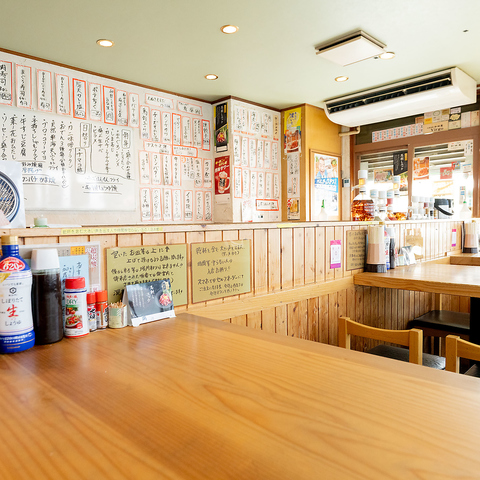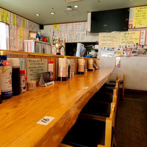 【仕事終わりにふらっと】常連様にも愛されるカウンター席。壁一面に貼られた料理札を眺めながら、今日は何を頼もうか考えるのも楽しみのひとつ。THE大衆居酒屋の空気を味わえる特等席です。