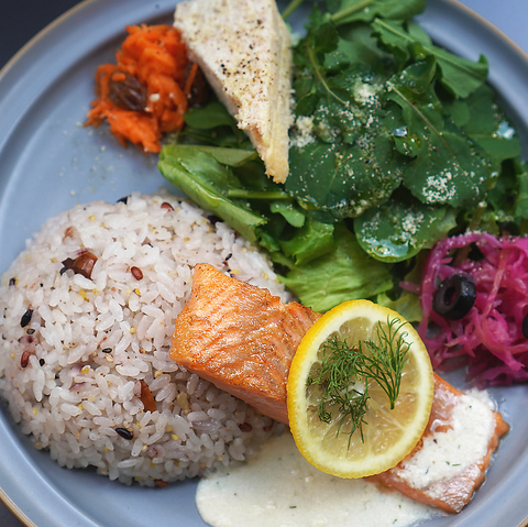 【数量限定】表面に火入れをした柔らかなレアサーモンに十六穀米と彩り豊かなデリサラダを添えたバランスの良いプレート特製のヨーグルトソースと合わせてお召し上がりください。デリ3種(キャロットラペ・紫キャベツのコールスロー・チキンムースのテリーヌ)
