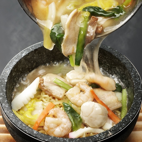 熱々、ジュージューの本場韓国の石鍋にとろ~り とあっさり味の広東風あんかけのやわらかな焼きそばです。石鍋でグツグツ煮立たせておりますので、いつまでも熱々な餡に麺を絡めて召し上がれ♪おこげがまた香ばしく食欲をそそる一品。お一人様で食べていただいてもいいですし、ご家族やお友達と一緒にシェアして頂いても◎