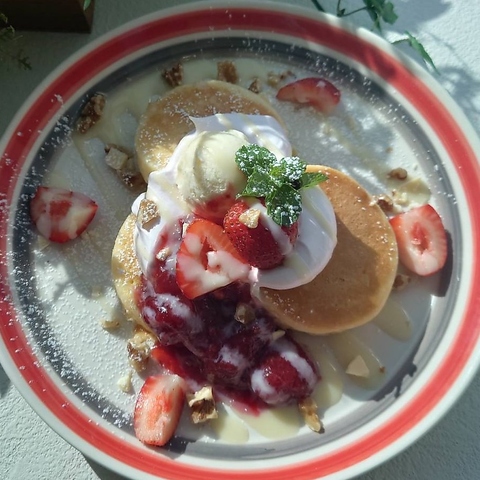 MJ人気メニュー!たっぷりのクリームと甘酸っぱいベリーが乗ったパンケーキです。