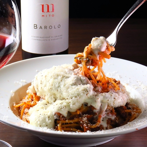 イタリア産チーズを3種類使ったボロネーゼ。初めてクイントにご来店される方には是非食べて頂きたい逸品!イタリアで修行した師匠直伝!たっぷりの香味野菜、トマト、赤ワインを使用し6時間かけて煮込み仕上げた本場の本格ボロネーゼに削りたての風味豊かなグラナパダーノ、マスカルポーネ、モッツァレラを3種類でソースと