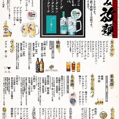 | 【ワイン・果実酒】 | 〈赤ワイン・ライトボディ〉・〈白ワイン・辛口〉・梅酒(ロック・水割り・お湯割り・ソーダ割り)・ゆず酒(ロック・水割り・お湯割り・ソーダ割り) |