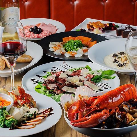 豪快な『丸ごとオマール海老とたっぷり魚介のトマトクリーム』や『北海道産”十勝ハーブ牛”イチボのタリアータ』、〆には『フォアグラと黒トリュフ香るリゾット』までついた贅沢プラン!