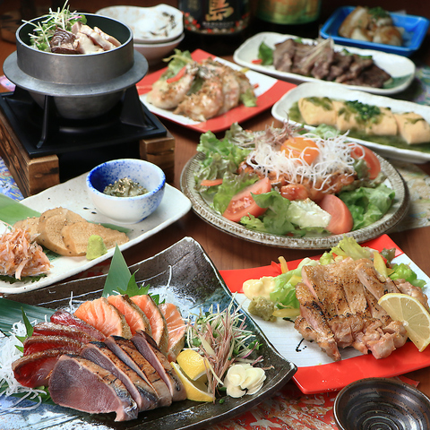 <飲み会|送迎会・歓迎会、各種宴会好評受付中!>「名物!鰹の藁焼き塩たたきとナスのたたき」や「サーモンのわら焼きカルパッチョ」などた藁やのおすすめを詰め込んだ飲み放題付き宴会コース!♪+800円でドリンク全品OKのプレミアム飲み放題に♪※L.O.30分前