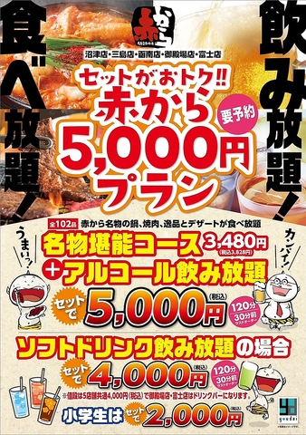来店したら必ず注文したい当店名物の「赤から鍋」が楽しめるコースを3種類をご用意しております。赤から鍋と焼肉を同時に味わえる120分食べ放題満腹コースは3058円(税込)!赤から鍋と特選焼肉が味わえる120分食べ放題プレミアムコースは3498円(税込)!120分食べ飲み放題プレミアムコースは4708円(税込)!ご予算に合わせてお選びいただけます