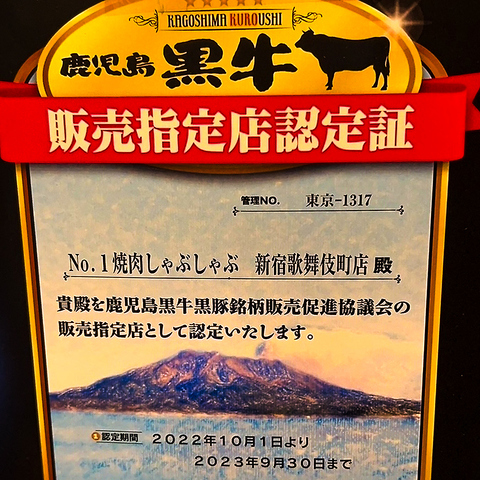 当店では皆様により良いお肉を提供すべく、鹿児島黒毛和牛を使用しております。また安心してお食事ができますよう、鹿児島黒毛和牛黒豚銘柄販売促進協議会の販売指定店の認定も頂いております。ぜひ、鹿児島黒毛和牛の旨味をお楽しみください♪(新宿 焼肉 個室 宴会 貸切 仕事帰り 週末 接待)