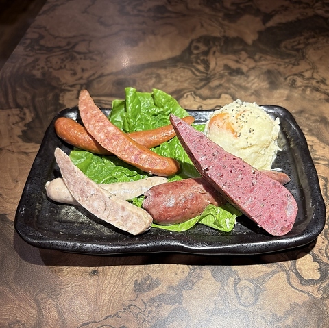 サルシッチャ(イタリア語でソーセージ)とチョリソーと蝦夷鹿のウィンナーの3種類の味をお楽しみください。