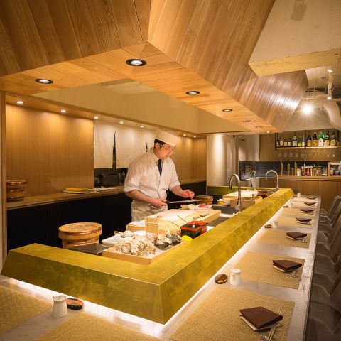 カウンター席【~13名様まで】職人の技を間近で堪能できるカウンター席。お寿司屋とダイニングバーの雰囲気が調和するスタイリッシュな空間です。ガラスのショーケースにはその日のおすすめ食材やデザートを並べております。お一人様でもデートのご利用でも気兼ねなくお過ごしいただけます。