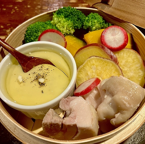 食欲の秋にぴったり♪「蒸し鶏と秋野菜のバーニャカウダ」野菜巻き串と一緒に!忘年会のご予約も受付中!