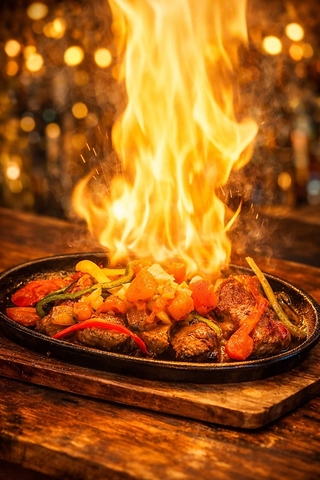 メキシコ風ステーキはお客様の目の前でフランベ!お肉が柔らかく、ついつい手が止まらなくなる逸品。炎が上がる瞬間はシャッターチャンス!!