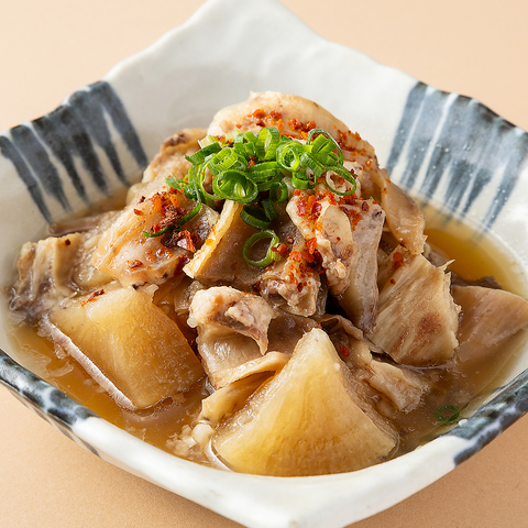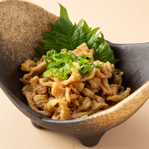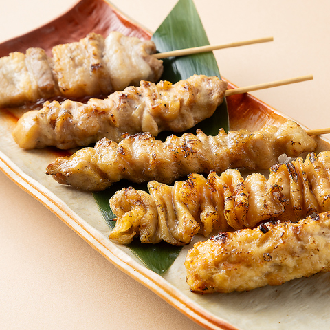 鶏皮と餃子の餡がしっかりマッチ!特製の甘めのタレを絡めました。