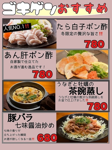 地酒・焼酎も厳選の品ぞろえ!ニュー以外にも、随時入れ替わるオススメメニューは是非店舗でチェックしてみてください。