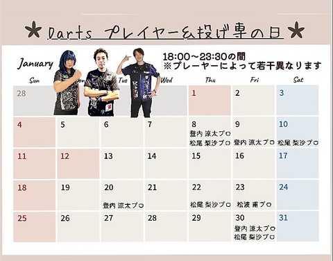 今月のDartsプレイヤー&投げ専の日のスケジュールはこちらです◎18:00~23:00の間※プレイヤーによって若干異なります。
