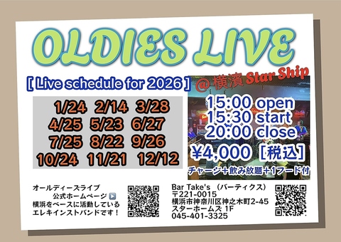 《OLDIES LIVE Schedule for 2026@横濱Star Ship》1/24・2/14・3/28・4/25・5/23・6/27・7/25・8/22・9/26・10/24・11/21・12/12〈Open15:00/Start15:30/Close20:00〉4000円(税込)チャージ+飲み放題+1フード付。