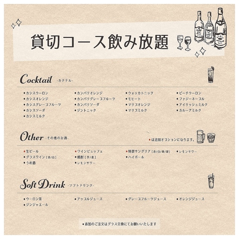 | その他 | 梅酒【ロック/ソーダ/水】、芋焼酎【ロック/ソーダ/水】、麦焼酎【ロック/ソーダ/水】 |