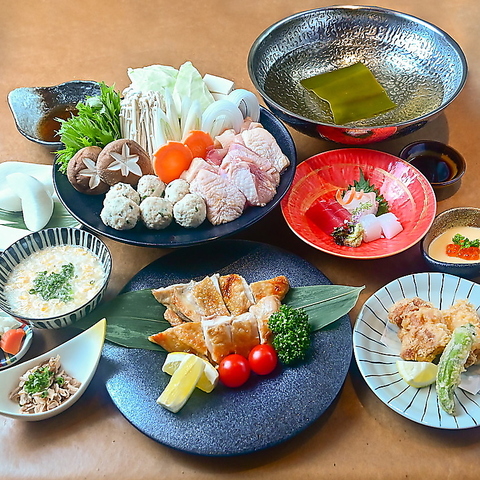 水炊き牡丹コース(6,600円)、紅葉コース(4,950円)、萩コース(3,850円)の3セットをご用意いたしました。こちらの写真は鶏の炭火焼+鶏天の入った贅沢なボリューム満点の牡丹コースです。別途飲み放題(90分)を2,200円(税込)でお付けいたします。