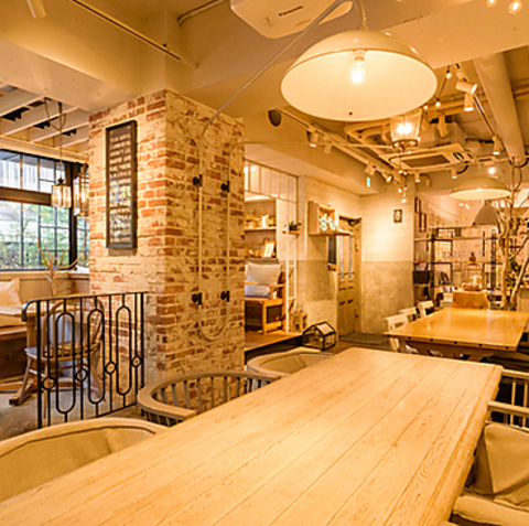 広々とした店内は、ナチュラルな木材とレンガ調の壁が調和し、居心地の良い空間を演出しています。中央のテーブル席は、友人や家族との楽しいひとときを過ごすのにぴったり。また、完全個室やソファ席など、様々な利用シーンに合わせた席種が揃っており、特別な日のお祝いからカジュアルなランチまで、多彩なシーンでお楽しみいただけます。