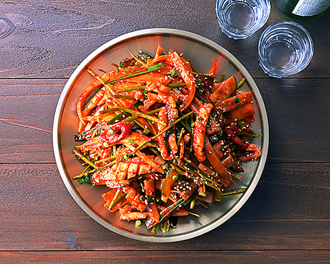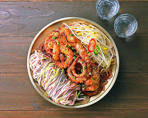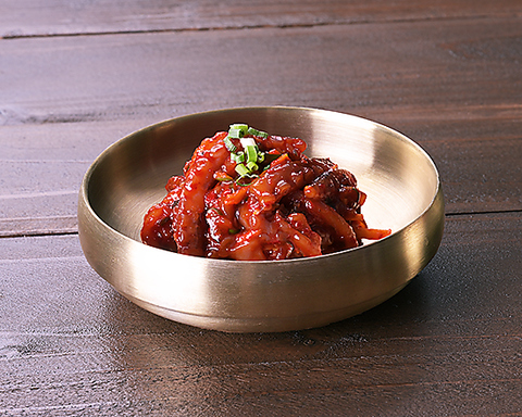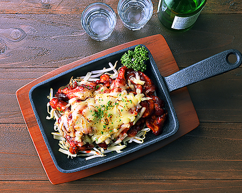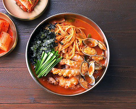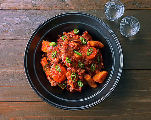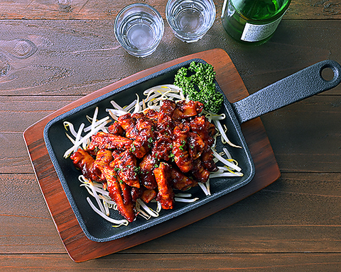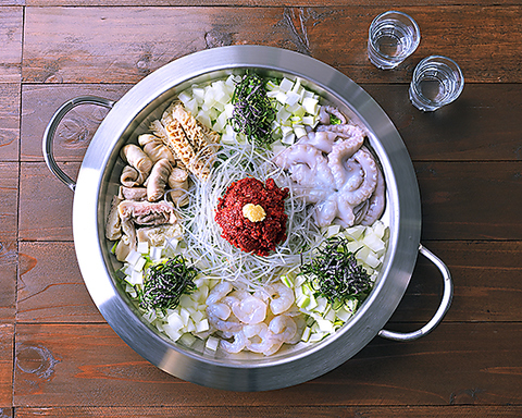 韓国・釜山発祥の伝統料理 ナッ(タコ)・コプ(牛ホルモン)・セ(エビ)をコチュジャンベースで炒めた鍋です※2~3人前
