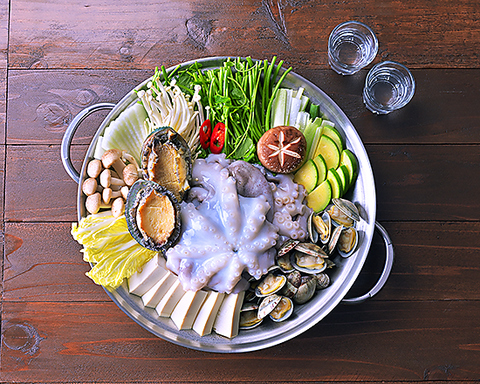 テナガダコを丸々1匹使った海鮮鍋料理 タコの食感とアワビや貝の出汁を味わう優しい味付の鍋です※2~3人前