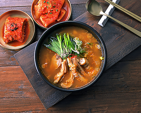豚の背骨・葉野菜を長時間煮込んだピリ辛スープ 酔い覚ましスープ(ヘジャンクク)はアミノ酸やミネラルが豊富で、肝機能サポートや疲労回復効果があるとされています※ご飯付き【ご飯は変更可能です!釜炊き五穀ごはん〈玄米・黒豆・黒米・麦・あわ〉⇒+220円(税込)】