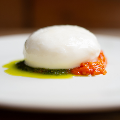 袋状のモッツァレラの中から、生クリームを含んだ柔らかなモッツアレラがさらにとろけるフレッシュチーズ「ブラータチーズ」。そこに世界一トマトというとても甘みの強い品種のトマトを使ったソースとジェノベーゼソースをご一緒にどうぞ。当店イチオシの一品です。