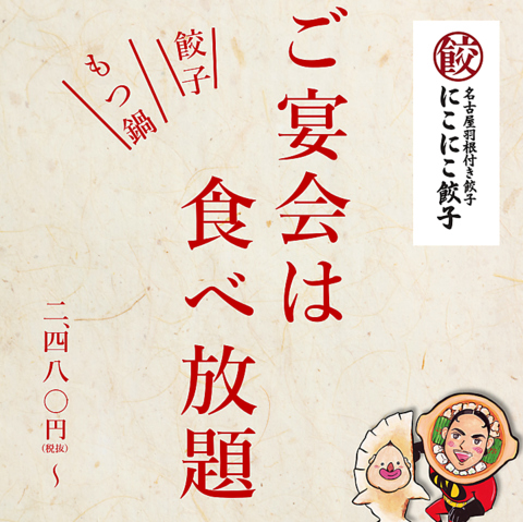 【大人数様での飲み会歓迎★知立にこにこ餃子の個室・お席ご紹介】デートや女子会にどうぞ!当店のコースは4000円~ご用意しております。名物の名古屋もつ鍋と自慢の羽根付きひとくち餃子が食べ放題!どのコースもたっぷり2時間の飲み放題がついているので、とてもお得です☆