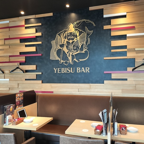 【テーブル席】黒地に金の豪華な恵比寿様が見える席でヱビスビールをどうぞ♪