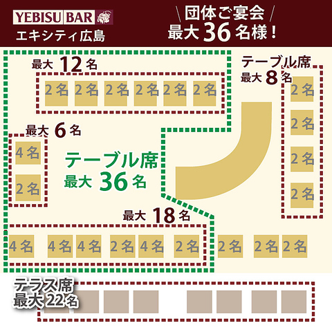 【テーブル席 最大36名様宴会OK!】縦で最大18名様&最大12名様、広島でのご宴会に◎ヱビス専門店の生ビール5種類も飲み放題コース有◎少人数~大人数まで、人数に合わせてレイアウト自在♪ご予約はお早めに!【19名以上はお電話でご予約ください!】