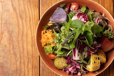 鎌倉の契約農家さんから届く新鮮な野菜を使ったサラダ、味が濃い野菜はワインのお供としても最高です。