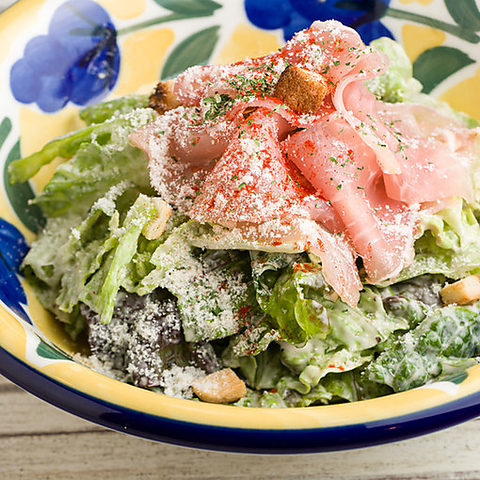 贅沢に生ハムをふんだんにのせた定番の一品。自家製シーザードレッシングを使用し食べ応え間違いなし!!