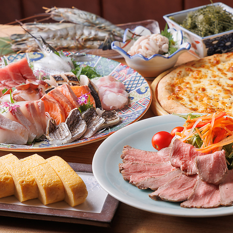女性限定のお得なコースをご用意しました!自慢の刺身盛り合わせやカルパッチョを始め、新鮮サラダやふわふわのだし巻き玉子、唐揚げとローストビーフの肉盛り、ピザなど、8種類の嬉しいメニューをご用意。さらに、平日は180分、金土は120分の飲み放題付き!友達と一緒に、楽しい時間をたっぷりお過ごしください。