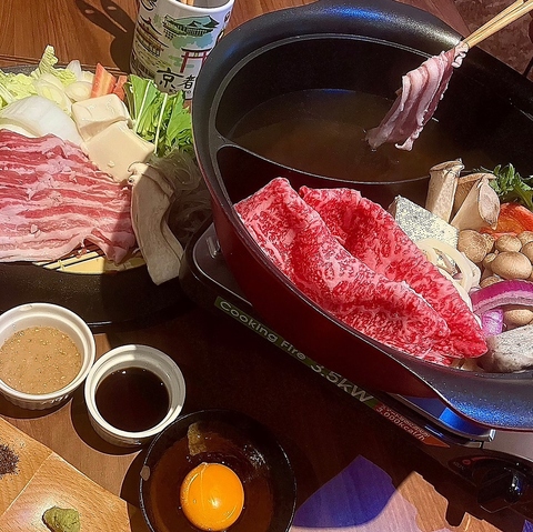 肉質が柔らかく、ジューシーで味わい深い「もち豚」「京都和牛」をすきしゃぶで♪コース欄よりご予約を♪