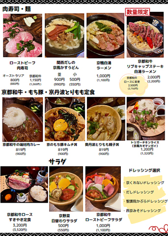 4名様までお座りいただけるテーブル席。ランチに、ディナーに、様々なシーンでご利用ください!自慢の京風ローストビーフ丼は9種類をご用意。お肉やご飯の量もお選びいただけます。