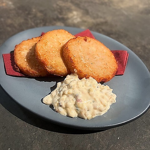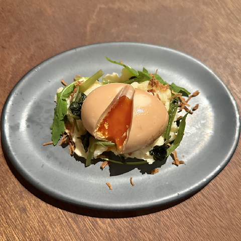 IDOLのポテトサラダは、とろりと黄身が溢れる燻たま乗せ!お酒にもよく合う人気の一品です!