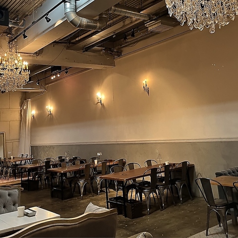 【2名様~6名様用】開放感あふれるテーブル席。頭上にシャンデリアが輝き、白いレンガの壁とモルタルを組み合わせた開放感あふれる空間で、 ごゆっくりお食事をお楽しみいただけます。