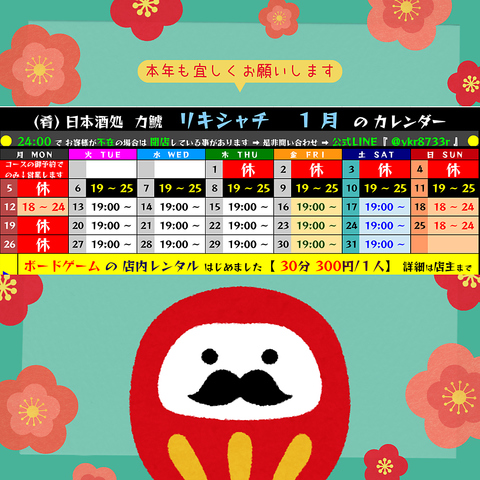 【新年あけましておめでとうございます】今年より毎月曜一週目の日曜は定休日とさせていただきまます。