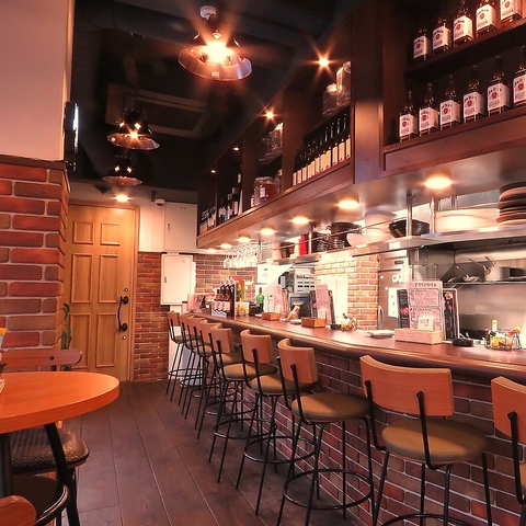 ブラウンを基調に、レンガ壁やアイアン家具がビンテージ感漂うスタイリッシュなカウンター席。おつまみやお酒の種類も豊富なので、ちょっと一杯飲みたい時、サクッとお食事したい時にも◎大人のリラックスタイムを楽しんで。