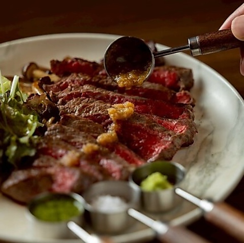 熟練のシェフが絶妙な火加減で焼き上げるステーキは、噛むほどに赤身の深い旨みが広がり、それでいて重すぎない極上の味わいです!お召し上がり方は3通り。肉の旨みを最大限に引き立てる淡路島産の藻塩、和の風味でさっぱりといただくわさびと醤油、そして玉ねぎの甘みと風味が豊かな特製ジャポネソース!