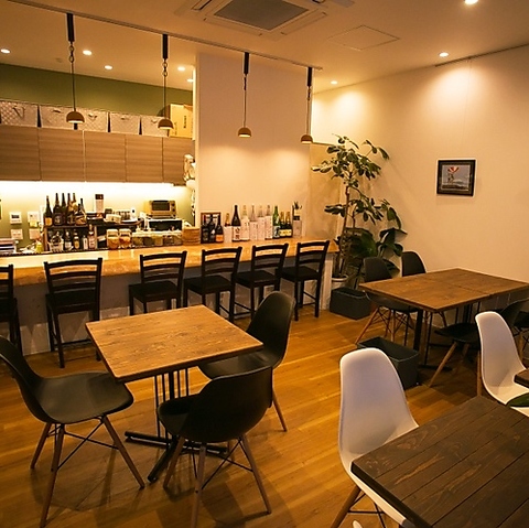 店内は、スタッフとの会話も楽しめるカウンター席(6席)と、人数に合わせて柔軟にレイアウト変更可能なテーブル席(12席)を完備しています。木の温もりを感じる落ち着いた内装は、居心地が良く、ついつい長居してしまいそう♪