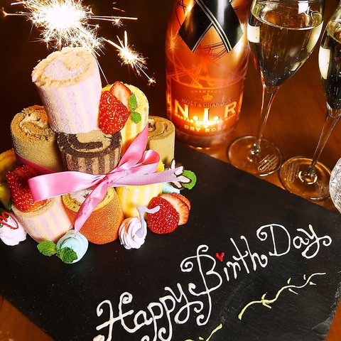記念日の演出致します♪クーポンのご利用で特製ロールケーキタワーもご用意しておりますので、特別な演出をご希望の方は是非お問い合わせください♪
