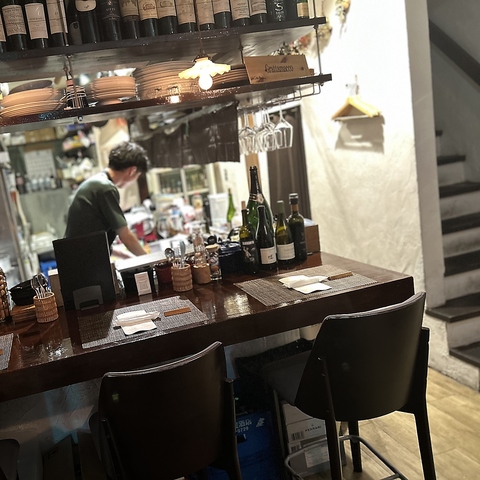 【1F】カウンター席はワインに詳しいオーナーとの会話もお楽しみいただけます。好みや予算に合わせたワインもご紹介。ワインとのマリアージュを楽しみながらお食事なんて夜はいかがでしょうか?