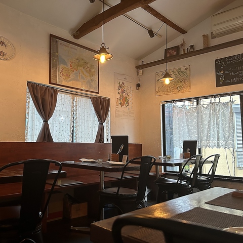 1階テーブル席は4名まで着席可能。開放感あふれる吹き抜けです。手作り料理のいい香りとともにお食事をお楽しみください。