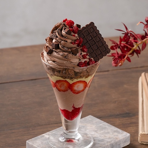 甘酸っぱいラズベリーとコクのあるピスタチオクリームが絶妙な季節限定のチョコレートパフェ♪