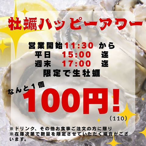 とろける旨み、今だけ100円(込110)!生牡蠣ハッピアワー開催中。何個食べてもこのお値段♪
