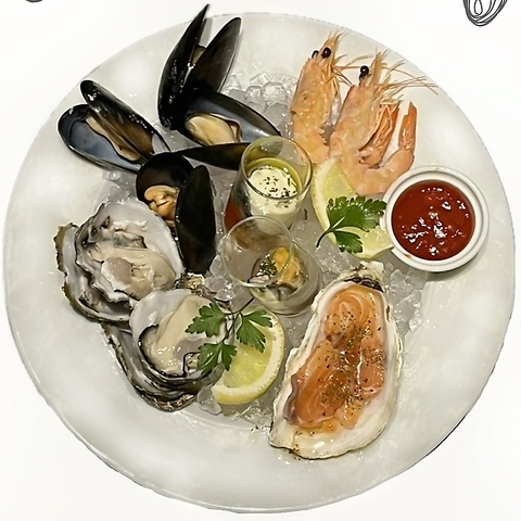 新鮮な魚介を贅沢に盛り合わせたシーフードプラッター。生牡蛎・天使エビ・国産ムール貝・オイスターシューター(ウニポン酢・チリタル)・サーモンを一皿に。素材の旨みを楽しめるよう、シンプルに仕上げました。
