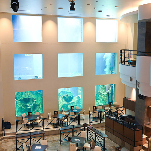 巨大水槽や外の景色を見ながらのお食事をお楽しみいただけます。夕方にはサンセットを見ながらのお食事を♪